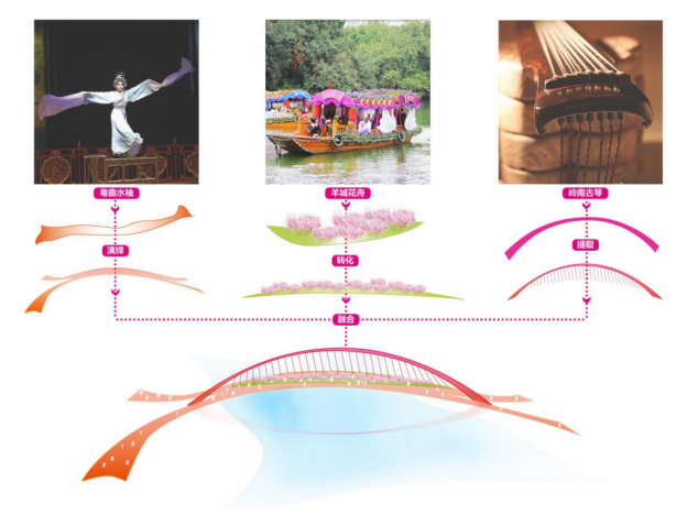 橋型設(shè)計吸取粵曲水袖、廣州水上花市、嶺南古琴等具有嶺南文化代表性的意象