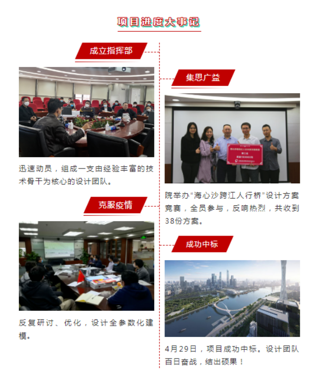 海心沙人行橋?qū)τ趶V州的城市建設(shè)發(fā)展意義重大。接到初步設(shè)計委托后,廣州市政總院迅速成立專門的項(xiàng)目指揮部,熊正元董事長親自動員,楊勇副總經(jīng)理擔(dān)任項(xiàng)目指揮長、設(shè)計一院童愷旻院長擔(dān)任副指揮長,寧平華總工程師擔(dān)任項(xiàng)目技術(shù)總負(fù)責(zé)人,設(shè)計一院總工樂小剛擔(dān)任技術(shù)副負(fù)責(zé)人。各專業(yè)緊急動員、積極配合,成立了一支技術(shù)經(jīng)驗(yàn)豐富、能打硬仗的設(shè)計團(tuán)隊(duì)。