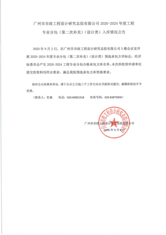 2020-2024年度工程專業(yè)分包(第二次補充)(設(shè)計類)入庫情況公告