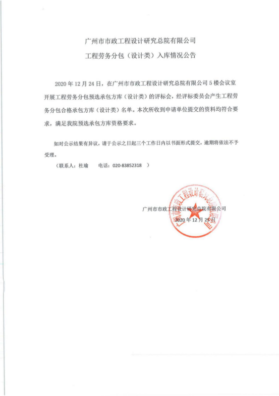 工程勞務(wù)分包(設(shè)計(jì)類)入庫(kù)情況公告