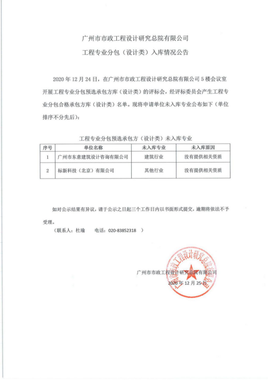 工程專業(yè)分包(設(shè)計類)入庫情況公告