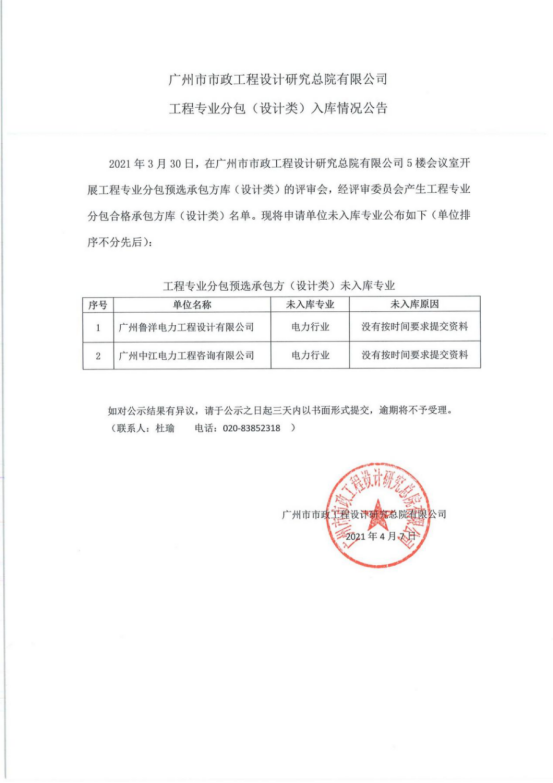 工程專業(yè)分包(設(shè)計類)入庫情況公告