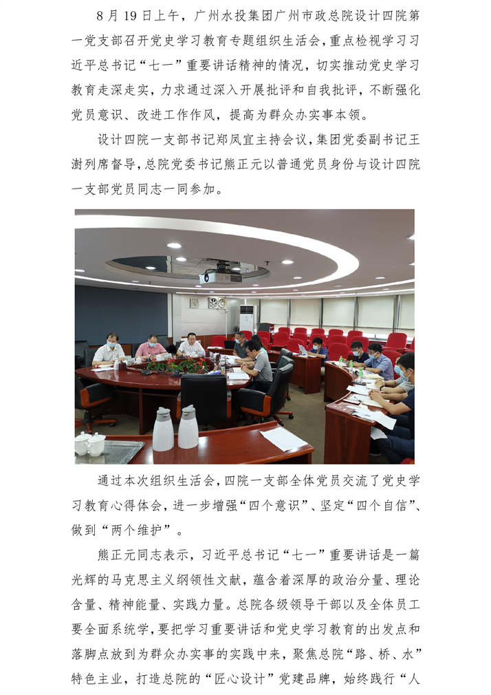 聚焦總院“路、橋、水”特色主業(yè) 打造總院的“匠心設(shè)計(jì)”黨建品牌——廣州水投集團(tuán)廣州市政總院設(shè)計(jì)四院第一黨支部召開黨史學(xué)習(xí)教育專題組織生活會 發(fā)布時(shí)間:2021-08-19閱讀次數(shù):
