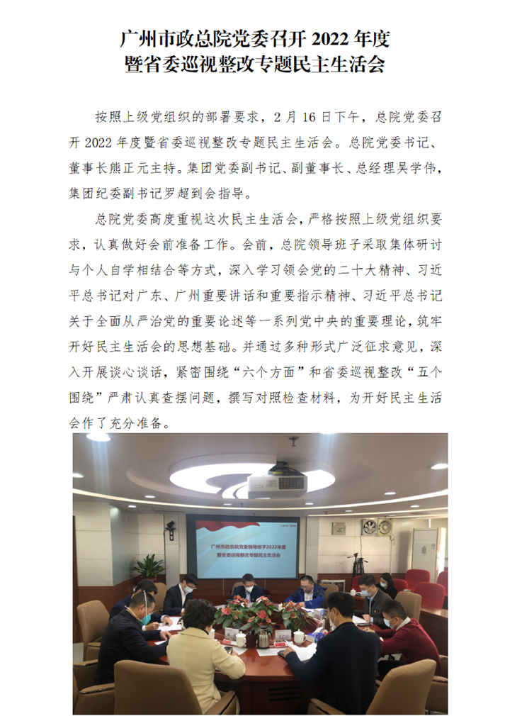 廣州市政總院黨委召開(kāi)2022年度暨省委巡視整改專題民主生活會(huì)