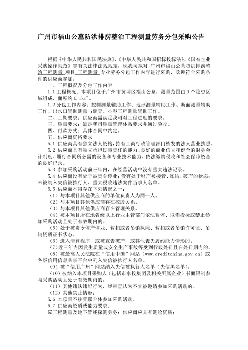 采購公告發(fā)布-廣州市福山公墓防洪排澇整治工程測量勞務(wù)分包