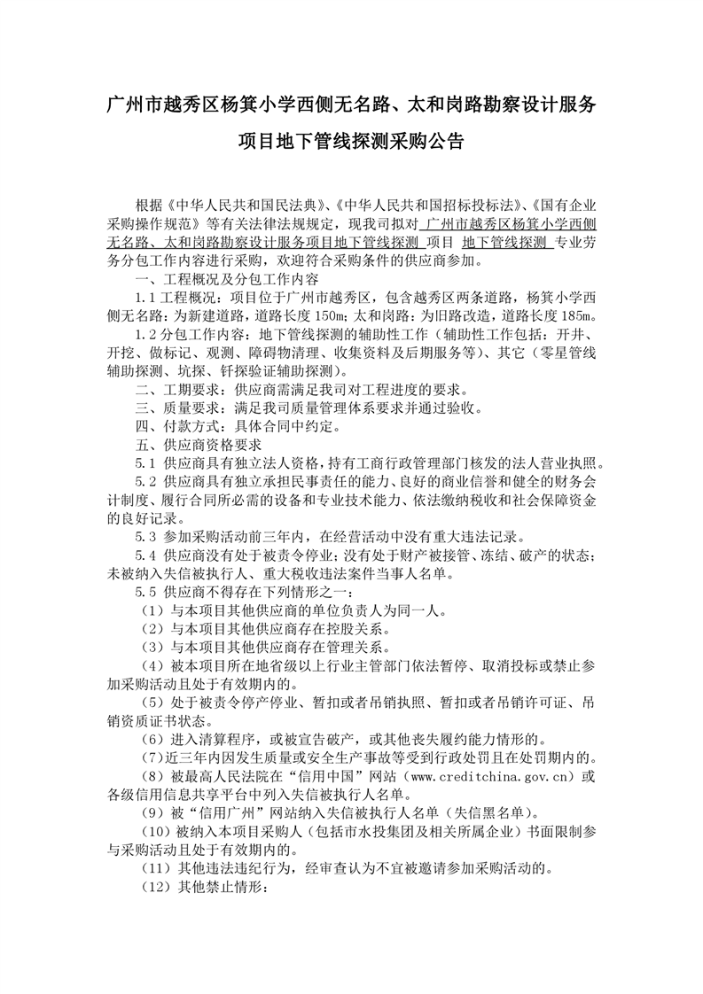 采購公告發(fā)布-廣州市越秀區(qū)楊箕小學西側無名路、太和崗路勘察設計服務項目地下管線探測